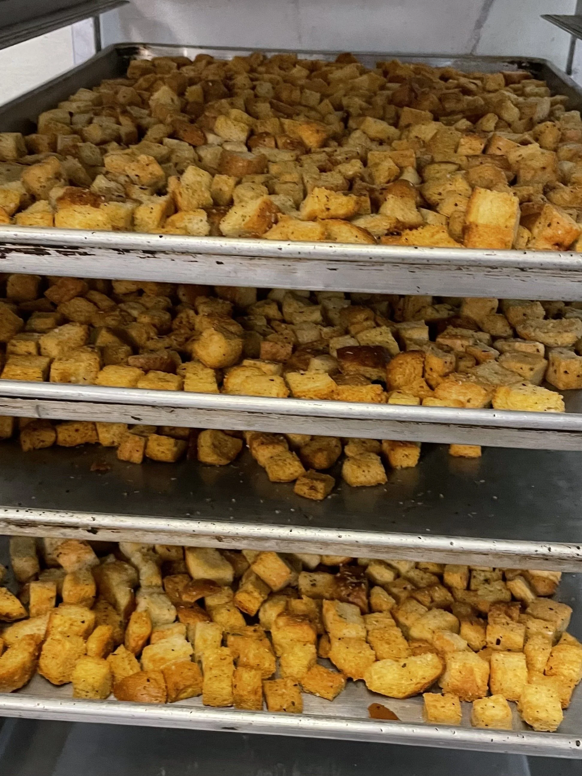 One way for us to immediately cut down on food waste is to use the bread we have leftover from our sandwich production to make delicious croutons!